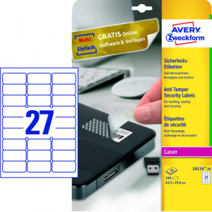 PAQUETE 20 HOJAS ETIQUETAS BLANCAS ANTI-MANIPULACION-IMPRESORAS LASER-63,5X29,6 MM AVERY L6114-20